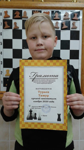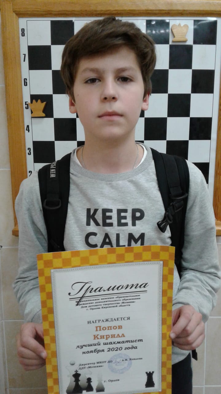 Подведены итоги ноябрьского этапа соревнования «Лучший шахматист месяца». Кардинальные перемены произошли в турнирной таблице. На сей раз первенство принадлежит Бересневу Илье и Сизовой Александре (объединение «Шахматы» 1 год обучения). Кстати сказать, Александра уже второй раз становится победительницей турнира. У ребят третьего года обучения вперёд вырвался Попов Кирилл. Тураев Тимур обошёл на 5 баллов Падерина Дмитрия и стал лидером среди шахматистов 5-го года обучения. Интересно, а кто же станет лидером в декабре, в уходящем 2020 году… Болеем и переживаем за наших ребят.